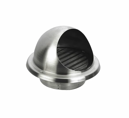 - Element wentylacyjny wykonany z kwasoodpornej stali nierdzewnej o średnicy 100 mm, służący jako czerpnia lub wyrzutnia. Produkt wyposażony w półkulistą osłonę zabezpieczającą oraz ukośne lamelki kierujące powietrze w dół. Dodatkowo posiada siatkę chroniąc