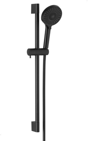 - Przesuwny zestaw prysznicowy ścienny w czarnym matowym kolorze, wykonany z mosiądzu i tworzywa ABS. Zawiera drążek natrysku, uchwyty ścienne (w tym jeden z możliwością dostosowania do starych otworów), rączkę natrysku z trzema strumieniami, wąż PVC 1500 m
