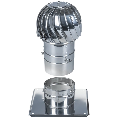 - Głowica obrotowa o średnicy 150 mm, wykonana ze stali nierdzewnej, przeznaczona do wspomagania ciągu kominowego. Dzięki zastosowaniu mechanizmu obrotowego na łożyskach kulkowych, głowica wykorzystuje siłę wiatru do stabilizacji ciągu kominowego. Wyposażon