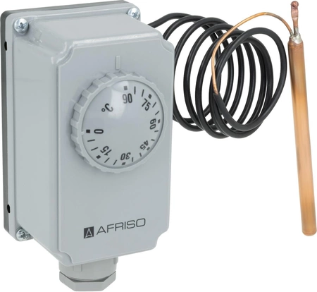 - Afriso TC2 – termostat zanurzeniowy z kapilarą 1000 mm. Regulacja temperatury 0-90°C, sterowanie urządzeniami grzewczymi, zewnętrzna nastawa, stopień ochrony IP40.