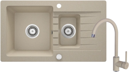 - Deante Zorba piaskowy – granitowy zlewozmywak 76x44 cm z dopasowaną baterią. Trwała, odporna na przebarwienia i wysoką temperaturę powierzchnia, właściwości hydrofobowe. 1,5-komorowa konstrukcja z ociekaczem i oszczędzającym miejsce syfonem Space-Saver. W