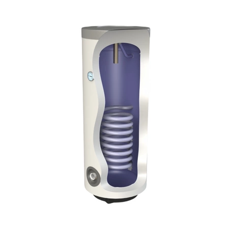 Zbiornik wykonano z wysokiej jakości stali pokrytej od wewnątrz specjalną emalią ceramiczną, która tworzy trwałą, szklistą warstwę chroniącą przed korozją. Dodatkowe zabezpieczenie stanowi anoda magnezowa, aktywnie chroniąca wnętrze zbiornika poprzez różnicę potencjałów elektrochemicznych. Wężownica o powierzchni 0,9 m² i pojemności 5 litrów zapewnia efektywną wymianę ciepła.