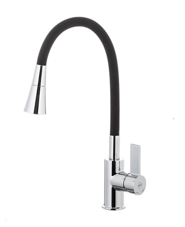 - KFA Armatura Rumba Duo 6553-925-00 – bateria kuchenna stojąca chrom-czarna z giętką wylewką (211 mm). Wyposażona w dwa tryby strumienia (standardowy i prysznicowy), regulator ceramiczny Ø35 i solidny system montażowy. Idealna do nowoczesnych kuchni.